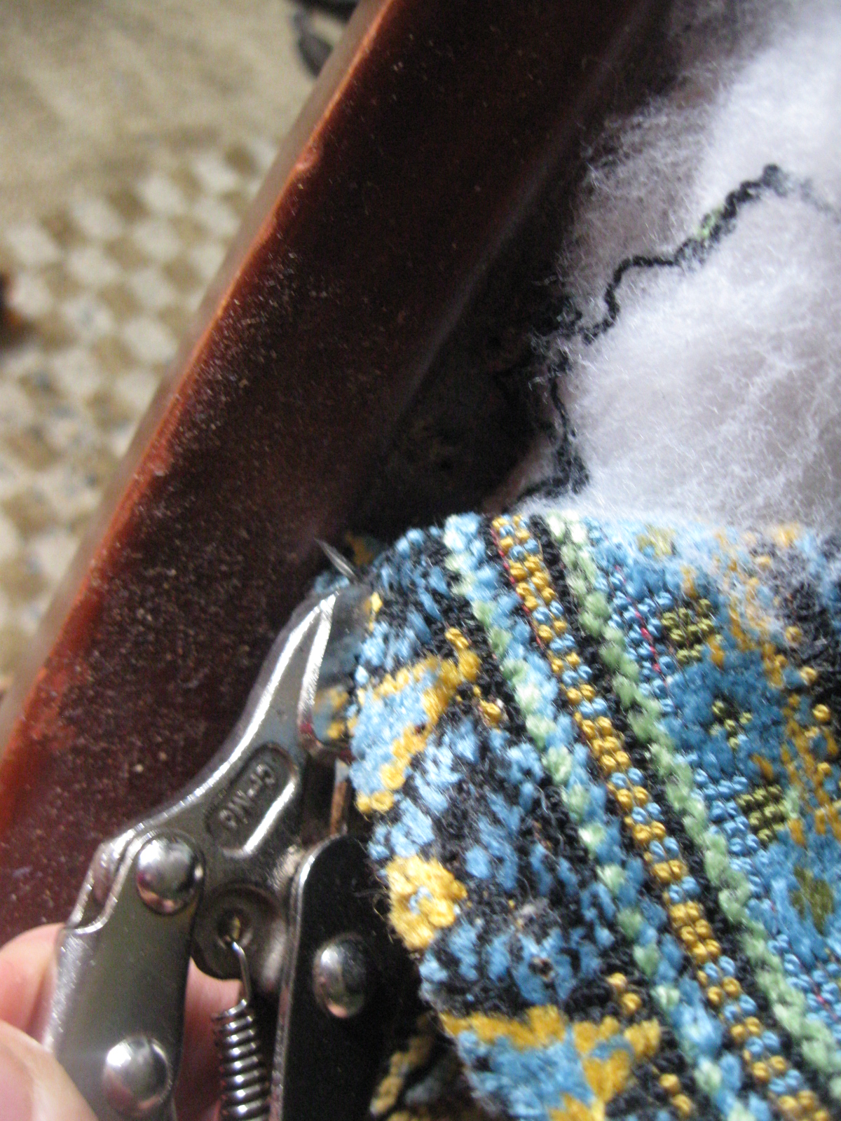 Like most any upholstery project, first you have to take off the old upholstery. I prefer to use a small pair of locking pliers, which allow me to grab nail heads and staples without destroying the woodwork. You need to keep the woodwork intact as much as possible so it can hold the new staples/nails you will be putting in.
